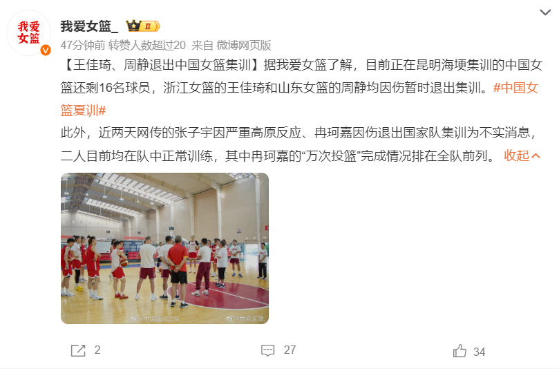 北京时间9月2日,根据博主我爱女篮的消息,目前正在昆明海埂集训的中国女篮还剩16名球员,浙江女篮的王佳琦和山东女篮的周静均因伤暂时退出集训。此外,近两天网传的张子宇因严重高原反应、冉珂嘉因伤退出国家队集训为不实消息,二人目前均在队中正常训练,其中冉珂嘉的“万次投篮”完成情况排在全队前列。